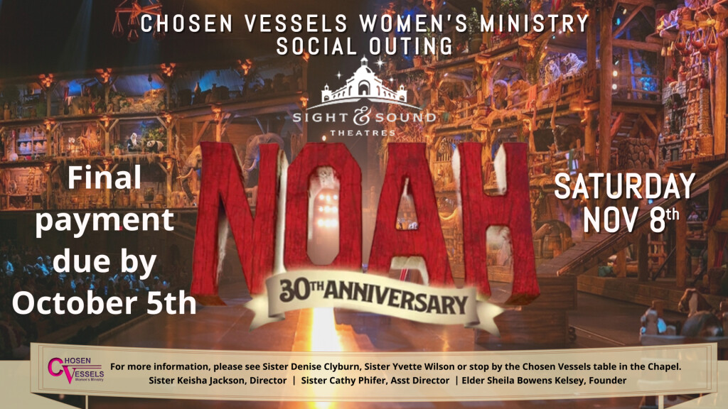 NOAH! Sight & Sounds- Chosen Vessels Women's Ministry Social Outing Saturday, November 08, 2025 6:00 AM - 9:00 PM300 Hartman Bridge Road , Road Ronks, PA , Ronks, PA US 17572