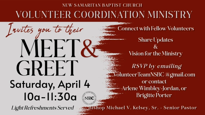 The NSBC Volunteer Coordination Ministry (VCM) is inviting you to a Meet & Greet!Date: Saturday, April 4, 2026Time: 10:00 - 11:30amLocation: NSBC...